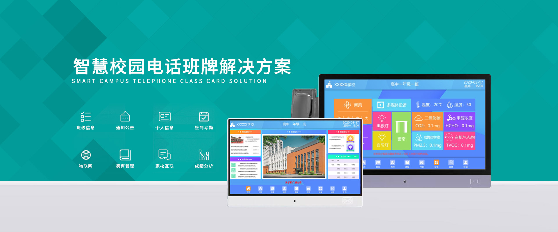 以及二氧化碳、甲醛濃度等教室設備環境進行一鍵控制,上課、自習、午休等多種場景模式,